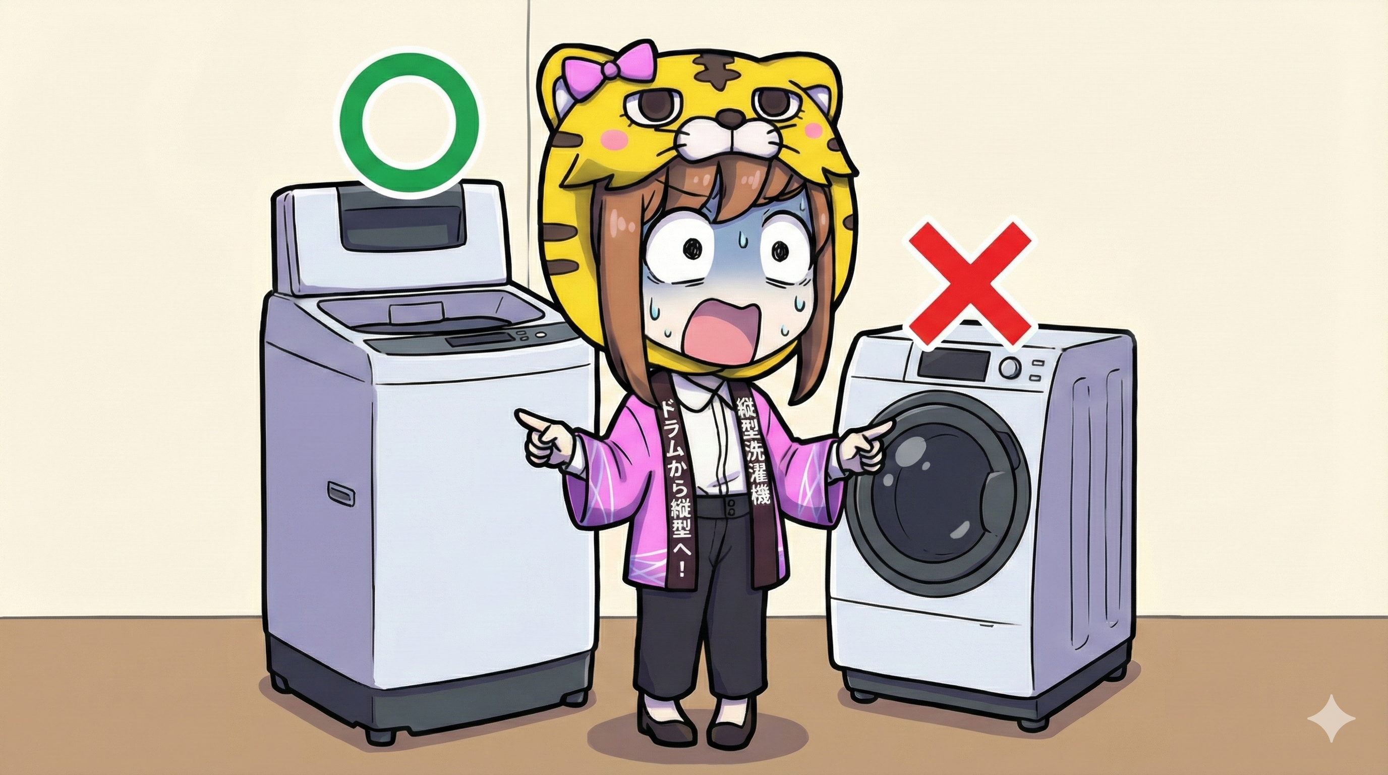 あんなにドラムが楽ちんなのに?縦型にしたら自分で洗濯物干すんだよ?